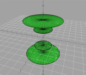 Die drei Grafiken zeigen dieselbe Abbildung mit den Funktionen fx=w*cos(v)*sin(u) und fy=w*sin(v)*sin(u) - beide zusammen bilden einen Flächenkreis - und der Funktion fz=w, bei der die z-Koordinate von Stützwert zu Stützwert einfach erhöht wird. Im ersten Bild bleibt w unverändert, wenn u und v erhöht werden - dann entsteht eine Anzahl von gestapelten Kreisebenen (hier 5, weil die Zahl der Stützwerte auf 5 festgelegt wurde). Wenn man wie im mittleren Bild w mit v erhöht, entsteht eine Schraube, Im dritten Bild wird w mit u erhöht, dann entstehen Paraboloide.