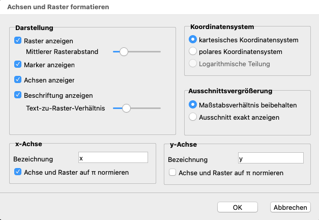 Beide Achsen können mit eigenen Texten bezeichnet werden. Außerdem können die Achsen statt auf ganzzahlige Werte auf π normiert werden - dies ist bspw. bei trigonometrischen Funktionen hilfreich.