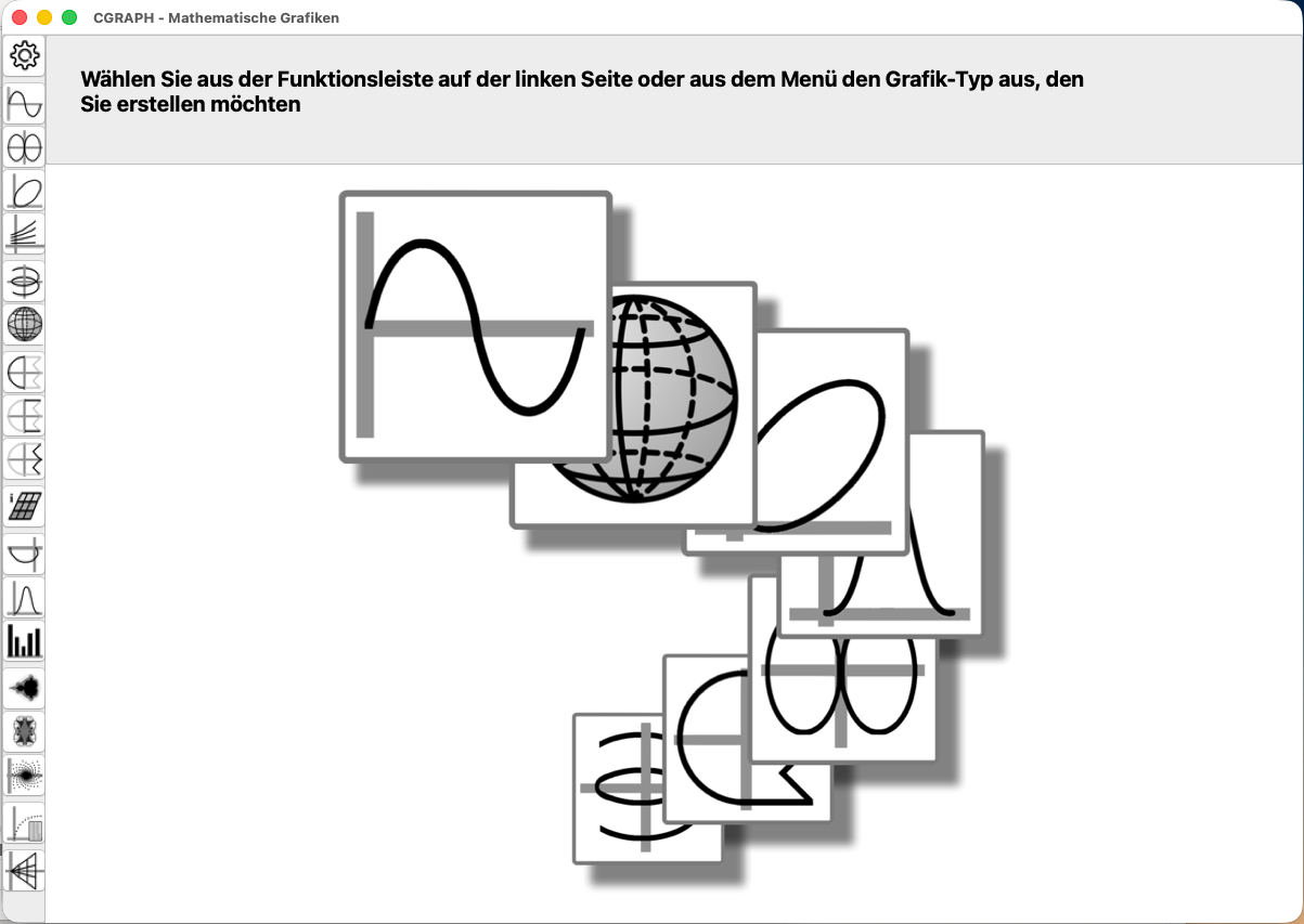Wenn CGRAPH gestartet wird, zeigt es das folgende Bild. Auf der linken Seite findet sich die Funktionenleiste, über die Grafiken erstellt werden können. Ebenso kann dafür das Menü benutzt werden. Unter Windows findet es sich am oberen Rand des CGRAPH-Fensters, unter macOS wird es am oberen Bildschirmrand dargestellt.