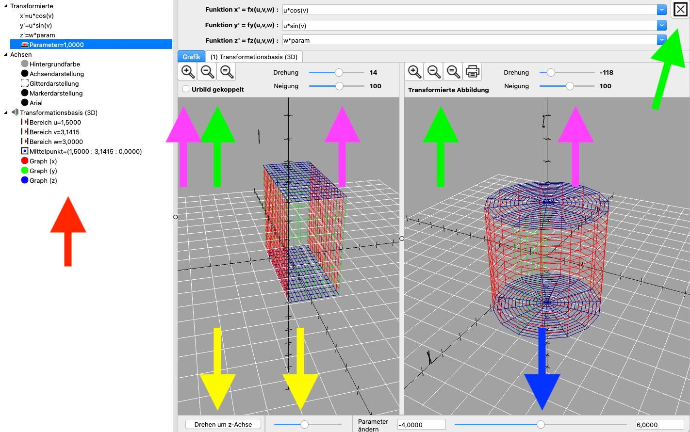 | Winkeleinstellungen (magentafarbene Pfeile) | Hier können die Drehwinkel des Urbilds und der transformierten Abbildung angepasst werden. |