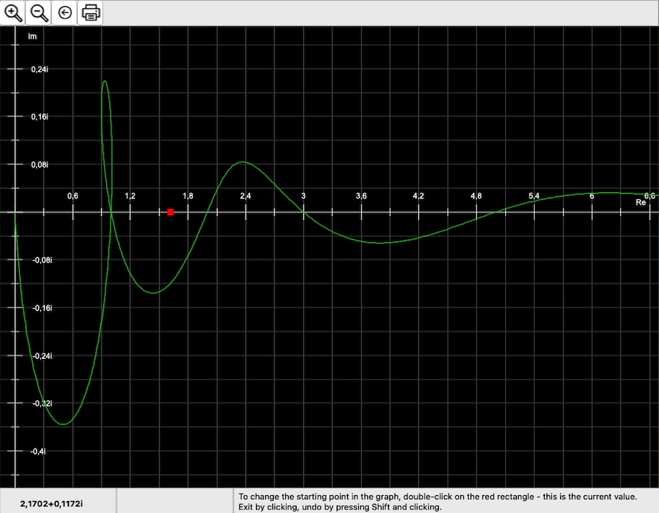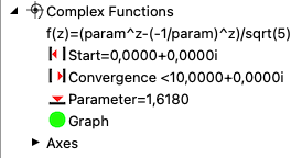 The example shows a function that returns the numbers of the Fibonacci sequence as zero points for a parameter tau (golden ratio = 1.6180339887…). However, if you vary the parameter, the display changes completely.