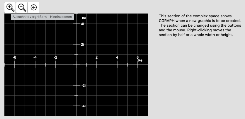 Here, you can use the mouse to zoom in or out, or use the three buttons above the graphics window to set the size of the initial section that CGRAPH should display in complex 2D graphics. This section does not have to be centred on the centre point.