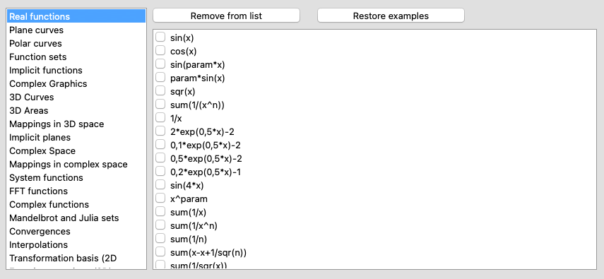 Immediately after installing CGRAPH, the list of functions already contains functions that are intended for testing purposes, but are also used in the examples in this documentation. If they (or parts of them) have been deleted, the Restore examples button will restore them.