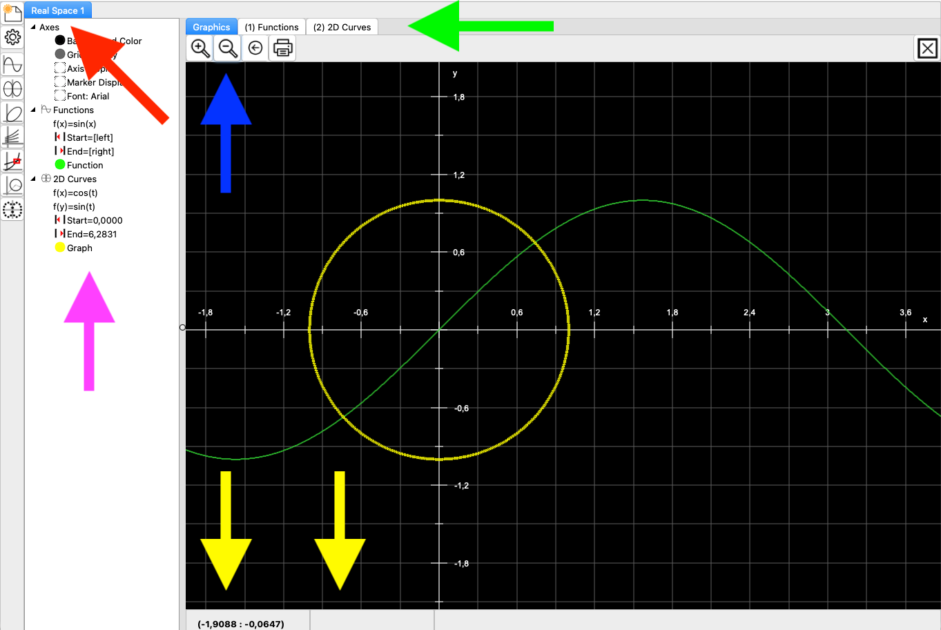 CGRAPH distinguishes between 2D displays and 3D displays. Depending on the graphic type, parameters can also be entered graphically. Here, CGRAPH distinguishes between real and complex parameters.