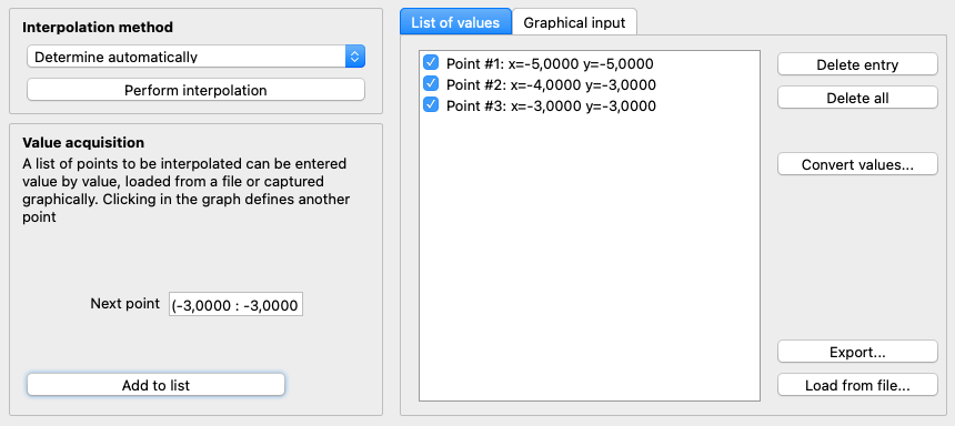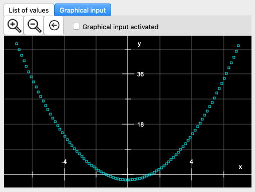 Individual values can be entered in the left-hand area and added to the list. Either a colon ‘:’ or a semicolon ‘;’ can be used as a separator. If only a number is entered, it is interpreted as an x-value. The corresponding y-value is automatically added and set to 0.