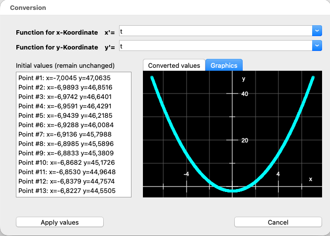 The converted values are displayed on the right-hand side of the window either graphically (with scales adjusted to the value pairs so that all values are visible) or as a list. The conversion takes place immediately after the functions have been entered. By clicking on Apply values, the converted values are then transferred to the list in the main window.