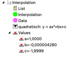 The display of the coefficients depends on the interpolation method. In the example, there are three coefficients a, b and c for a quadratic parabola. The determined function is displayed in the right-hand area. It can be edited; the result is then immediately visible in the graphic. In this way, the function can be further adjusted to the individual values.