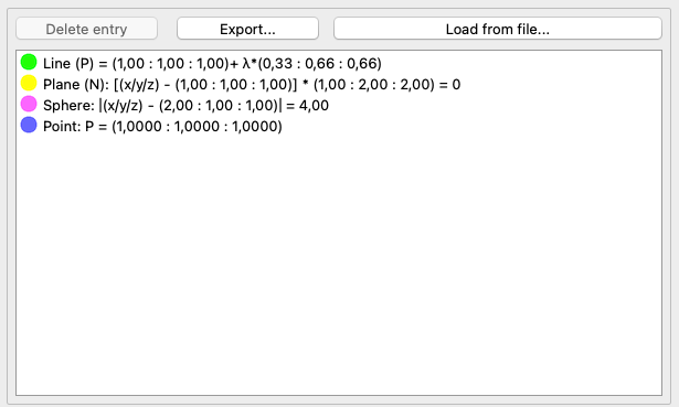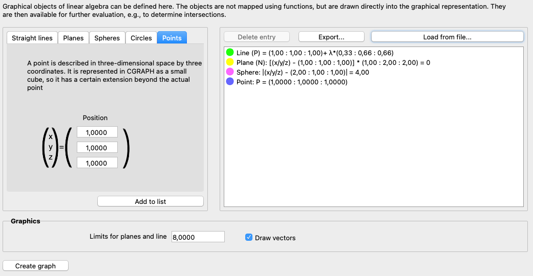Linear algebra (also known as vector algebra) is a branch of mathematics that deals with vector spaces. Similar to other branches of mathematics, structure-preserving mappings, which in linear algebra are linear mappings, are of particular interest. CGRAPH allows the representation of lines, planes and spheres in 3D space and can calculate intersections.