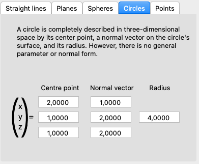 A circle is described by its centre point, a normal vector in the circle plane and its radius. The radius and the vectors (separately for the x, y and z coordinates) can be entered in the Circles tab. Clicking on the Add to list button then displays the circle in the right-hand window. A check is performed to see whether the circle is already part of the list.