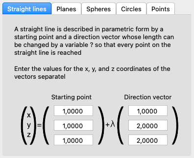 A straight line in parametric representation has a starting point and a direction vector. Both can be entered separately for the x, y and z coordinates in the Straight lines tab. Clicking on the Add to list button then displays the straight line in the right-hand window. A check is performed to see whether the line is already part of the list. CGRAPH also recognises entries that do not have exactly the same definition (e.g. a different starting point) but still describe the same line.