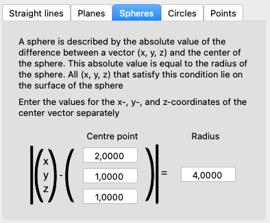 A sphere is described by the absolute value of the difference between a vector (x/y/z) and the centre of the sphere. For all (x/y/z) on the sphere, this absolute value is equal to the radius of the sphere. The radius and the vector (separately for the x, y and z coordinates) can be entered in the Spheres tab. Clicking on the Add to list button displays the sphere in the right-hand window. A check is performed to see if the sphere is already part of the list.