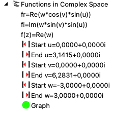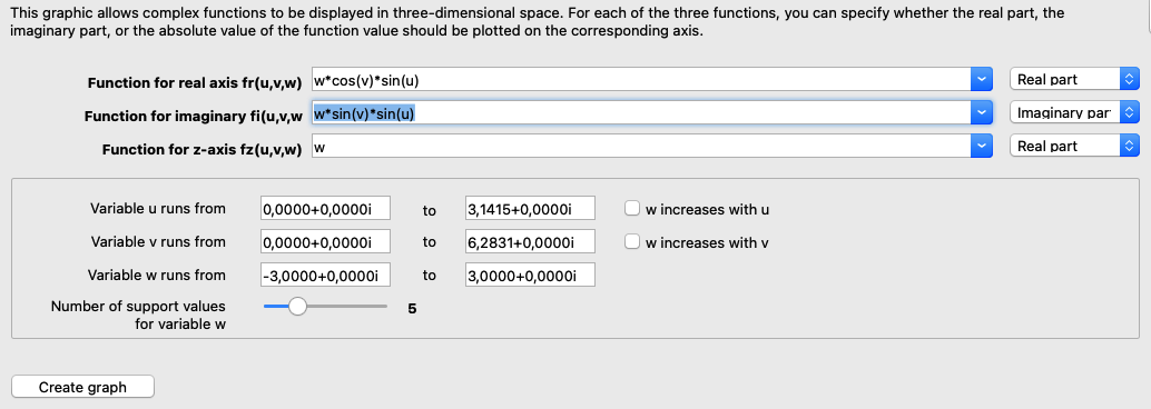 To emphasise the independence of the variables from the coordinate axes, only the names u, v, w and param are possible here. The variables may also take complex values; only the parameter is restricted to real numbers. Enter the desired terms in the input fields for the functions, or select one of the existing terms by clicking on the arrow to the right of the input field. All three terms can depend on u, v and w.