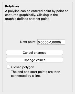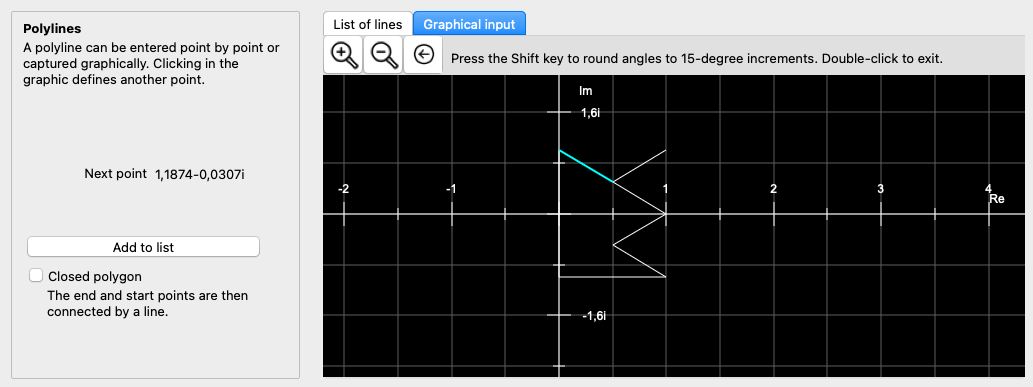Complex numbers can be entered in the Next point field. After clicking on Add to list, they appear in the List of lines.