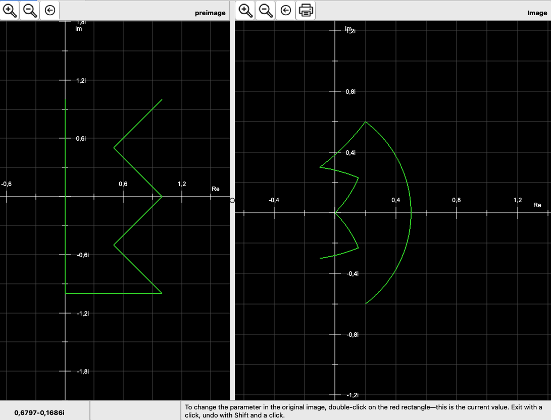 The function is defined uniformly here above the default values for all types of area images, because common images only make sense if the same function is used. The variable names z and param (as complex numbers) as well as x and y (as the real and imaginary parts of the variable z) are permitted.