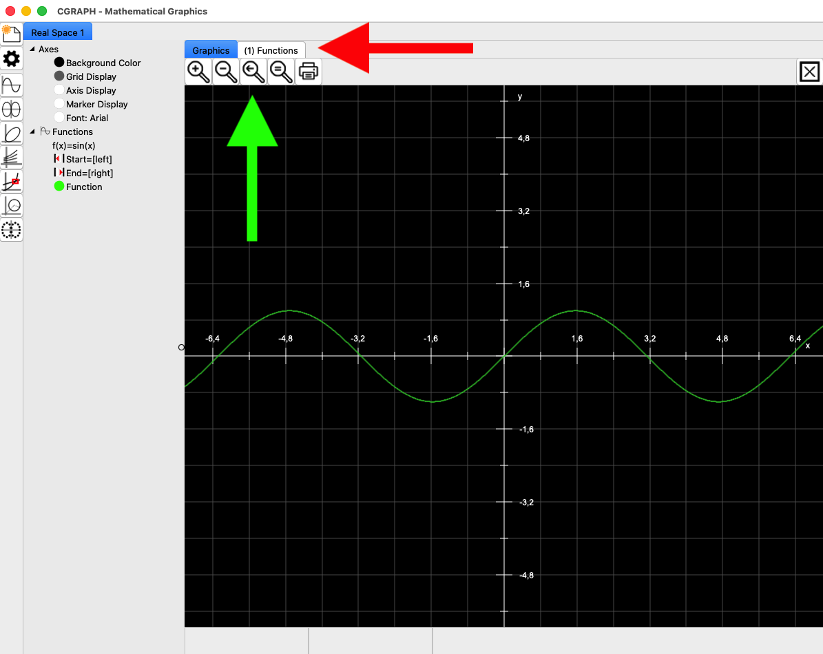CGRAPH now switches to the Graph tab and displays the sine curve. You can return to the previous settings and modify them at any time – simply click on the (1) Functions tab again (red arrow). Incidentally, the number is sequential – if you run this example after other graphs have already been created, a higher number will appear here.
