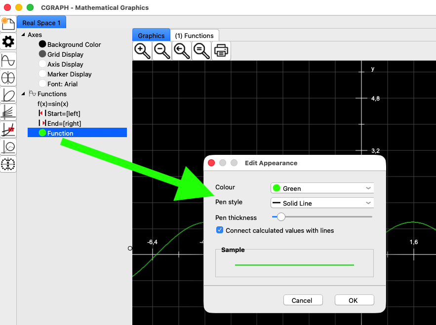 The tree on the left-hand side always displays the respective default settings for the graphs, but it also allows you to change the display. If you double-click on the text ‘Function’ (green arrow), a window appears for visual adjustment of the graph.