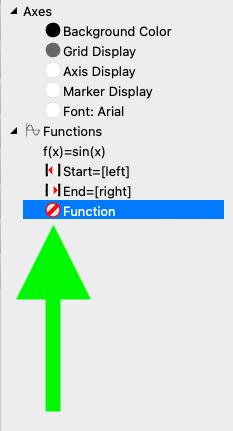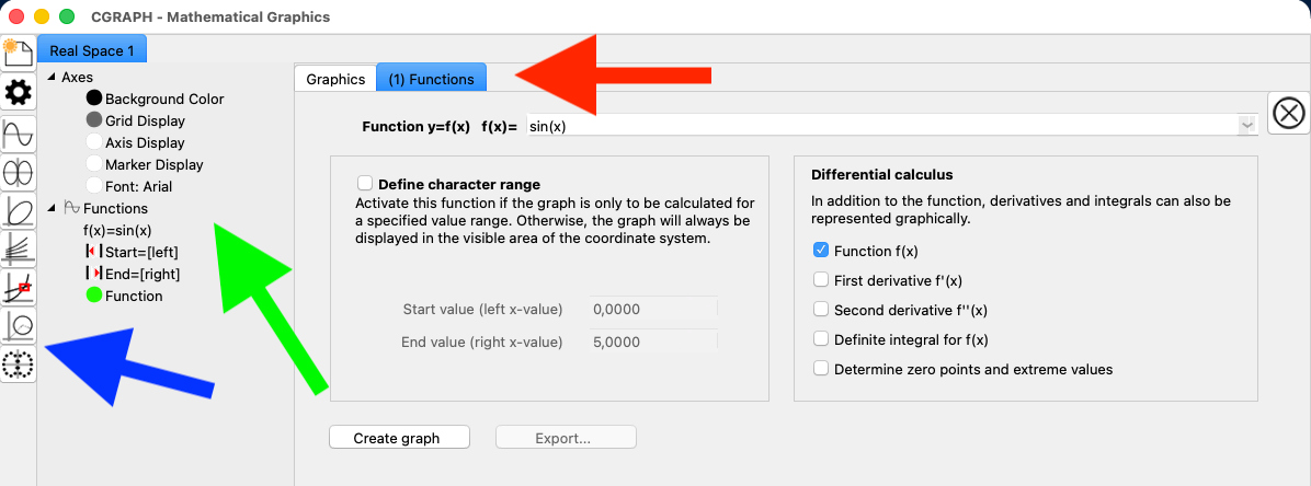 The window contents now change. On the left (green arrow), a tree appears in which all the contents of a graph are listed and where their colours and appearance can be changed. In the right-hand pane, a window appears containing the default values for the graphing function (red arrow). Furthermore, the function bar on the left-hand side is restricted to all graphing functions that can later be displayed in the same graph window. All others are hidden.