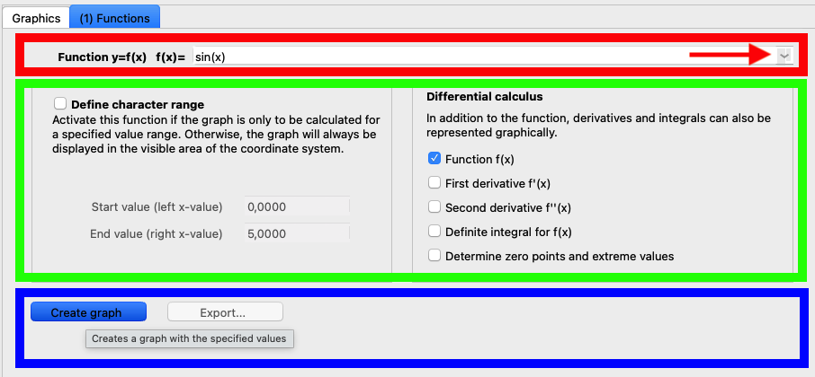 First, we need a function (red frame). When CGRAPH is first launched, some example functions are already predefined – so simply click the arrow to the right of the function field, where the function sin(x) is listed. Of course, the field also allows you to enter the function using the keyboard. A complete overview of all possible functions and the function syntax can be found here.