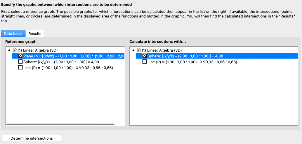 The sections are only calculated for the areas for which graphics have been created. If (additional) sections are outside this area, they are not taken into account. The elements of linear algebra are an exception – here, sections are calculated based on the entered vectors. However, section lines are only drawn within a specified space.