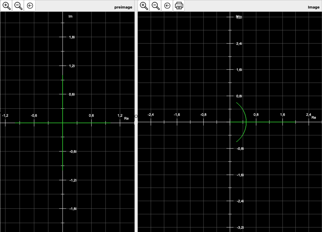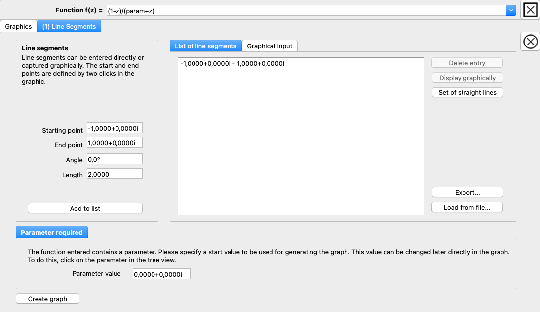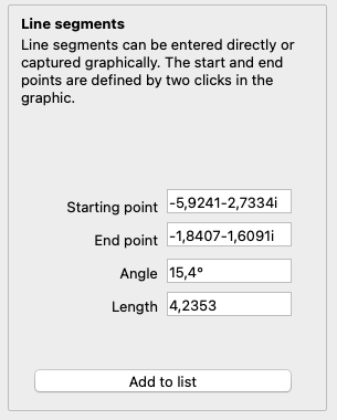 In CGRAPH, line segments, i.e. lines with defined start and end points, can be mapped onto the complex plane. Either the end point or the length and angle of the line segment can be specified.