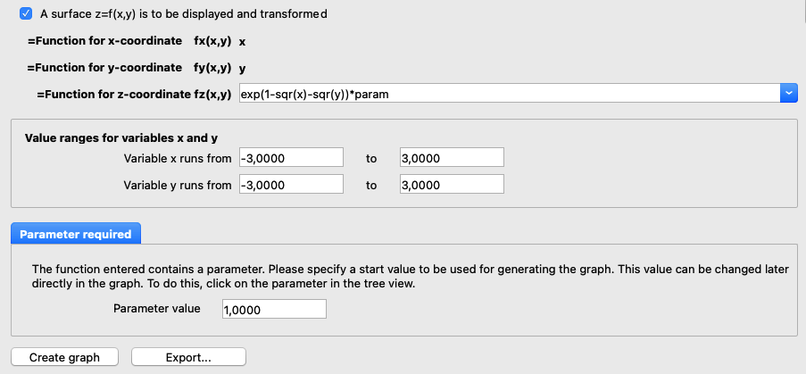 In addition to the transformation functions for the coordinate system, the mapping functions for the graphics must also be selected. For better differentiation, only functions containing the variables x, y and param are permitted. Enter the desired functions in the input field for the functions, or select one of the existing functions by clicking on the arrow to the right of the respective input field. A checkbox allows you to enter only one function if you only want a mapping of the form z = f(x,y). In addition, the value range for the variables x and y can be selected.