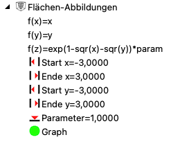 Dazu müssen zusätzlich zu den Transformationsfunktionen für das Koordinatensystem die Abbildungsfunktionen für die Grafik gewählt werden. Zur besseren Unterscheidung sind nur Funktionen zulässig, die die Variablen x, y und param enthalten. Geben Sie im Eingabefeld für die Funktionen die gewünschten Funktionen ein, oder wählen Sie eine der bereits vorhandenen Funktionen durch Klick auf den Pfeil rechts vom jeweiligen Eingabefeld. Eine Checkbox erlaubt die verkürzte Eingabe nur einer Funktion, falls lediglich eine Abbildung der Form z = f(x,y) gewünscht ist. Zudem kann der Wertebereich für die Variablen x und y gewählt werden.