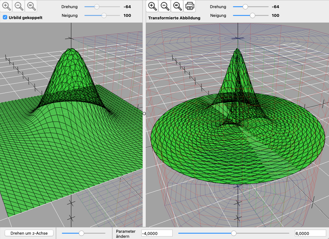 Neben der grafischen Darstellung von Flächen im Raum können deren Graphen zusätzlich auch koordinatentransformiert werden. CGRAPH bildet dabei die kartesische Darstellung im transformierten 3D-Koordinatensystem ab.