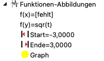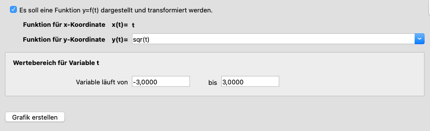 Dazu mussen zusätzlich zu den Transformationsfunktionen für das Koordinatensystem die Abbildúngsfunktionen für die Grafik gewähkt werden. Zur besseren Unterscheidung sind nur Funktionen zulässig, die die Variablen t und param enthalten. Geben Sie im Eingabefeld für die Funktionen die gewünschten Funktionen ein, oder wählen Sie eine der bereits vorhandenen Funktionen durch Klick auf den Pfeil rechts vom jeweiligen Eingabefeld. Eine Checkbox erlaubt die verkürzte Eingabe nur einer Funktion, falls kein Kurvenverlauf x(t) und y(t), sonder nur eine Funktion y = f(t) dargestellt werden soll. Zudem kann der Wertebereich für die Variable t gewählt werden.