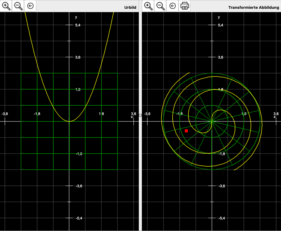 Im Beispiel wird eine quadratische Parabel in ein polares Koordinatensystem transformiert. Die Gitterdarstellung der Transformationsbasis ist dazu zur besseren Übersicht auf transparent geschaltet.