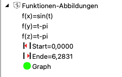Dazu müssen zusätzlich zu den Transformationsfunktionen für das Koordinatensystem die Abbildungsfunktionen für die Grafik gewählt werden. Zur besseren Unterscheidung sind nur Funktionen zulässig, die die Variablen t und param enthalten. Geben Sie im Eingabefeld für die Funktionen die gewünschten Funktionen ein, oder wählen Sie eine der bereits vorhandenen Funktionen durch Klick auf den Pfeil rechts vom jeweiligen Eingabefeld. Eine Checkbox erlaubt die verkürzte Eingabe nur einer Funktion, falls kein Kurvenverlauf x(t) und z(t), sondern nur eine Funktion y = f(t) dargestellt werden soll. x((t) wird dann zu t, zTT) zu 0 gesetzt, es entsteht also eine Funktion in der u-v-Ebene. Zudem kann der Wertebereich für die Variable t gewählt werden.