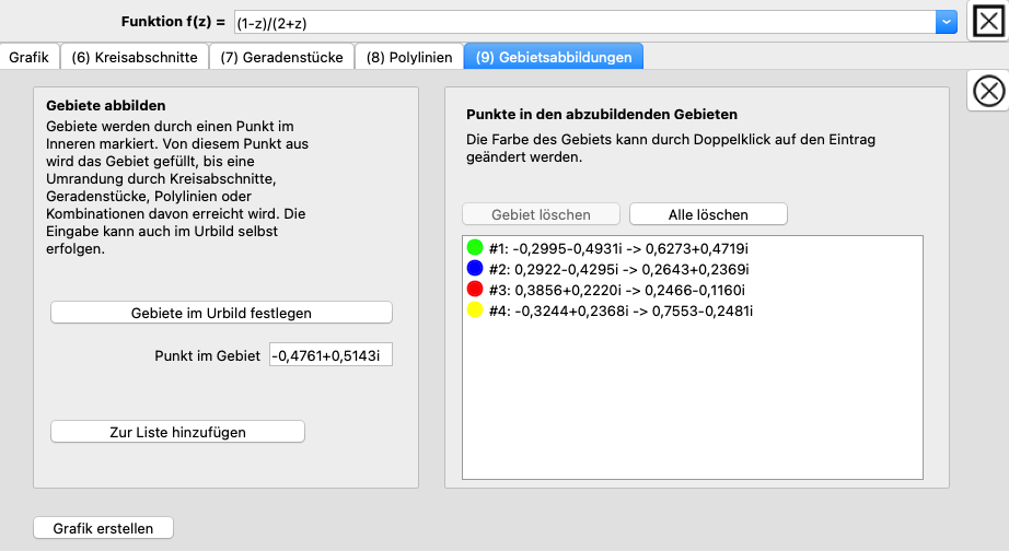 Im Feld Punkt im Gebiet können komplexe Zahlen eingegeben werden. Nach einem Klick auf Zur Liste hinzufügen erscheinen sie in der Liste auf der rechten Seite. Den einzelnen Punkten werden unterschiedliche Farben zugewiesen. Diese können durch Doppelklick auf einen Eintrag in der Liste geändert werden.