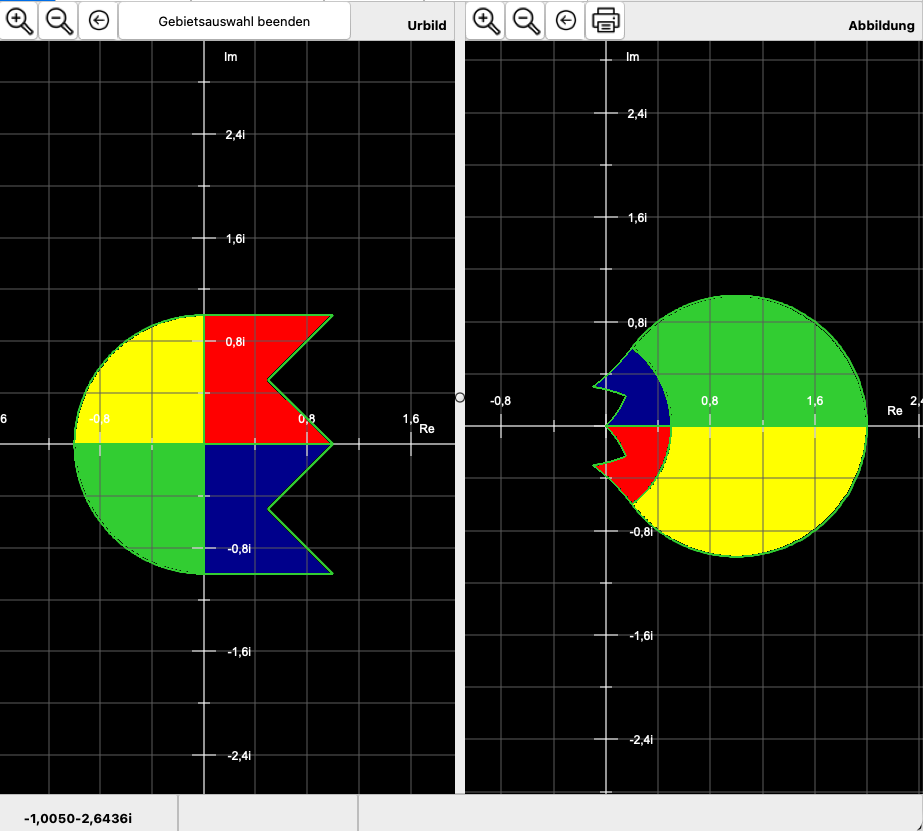 Durch einen Klick auf den Schalter Gebiete im Urbild festlegen schaltet CGRAPH auf den Reiter Darstellung um und zeigt Urbild und Abbildung. Durch einen Klick in ein Gebiet werden nun automatisch das Gebiet und seine Abbildung eingefärbt. Wenn das Gebiet „offen“ ist, also keine Begrenzung hat, wird das gesamte erreichbare Gebiet eingefärbt. Oberhalb des Urbilds findet sich dann der Schalter Gebietsauswahl beenden. Danach führen Klicks in das Urbild nicht mehr zu weiteren Definition von Gebieten.