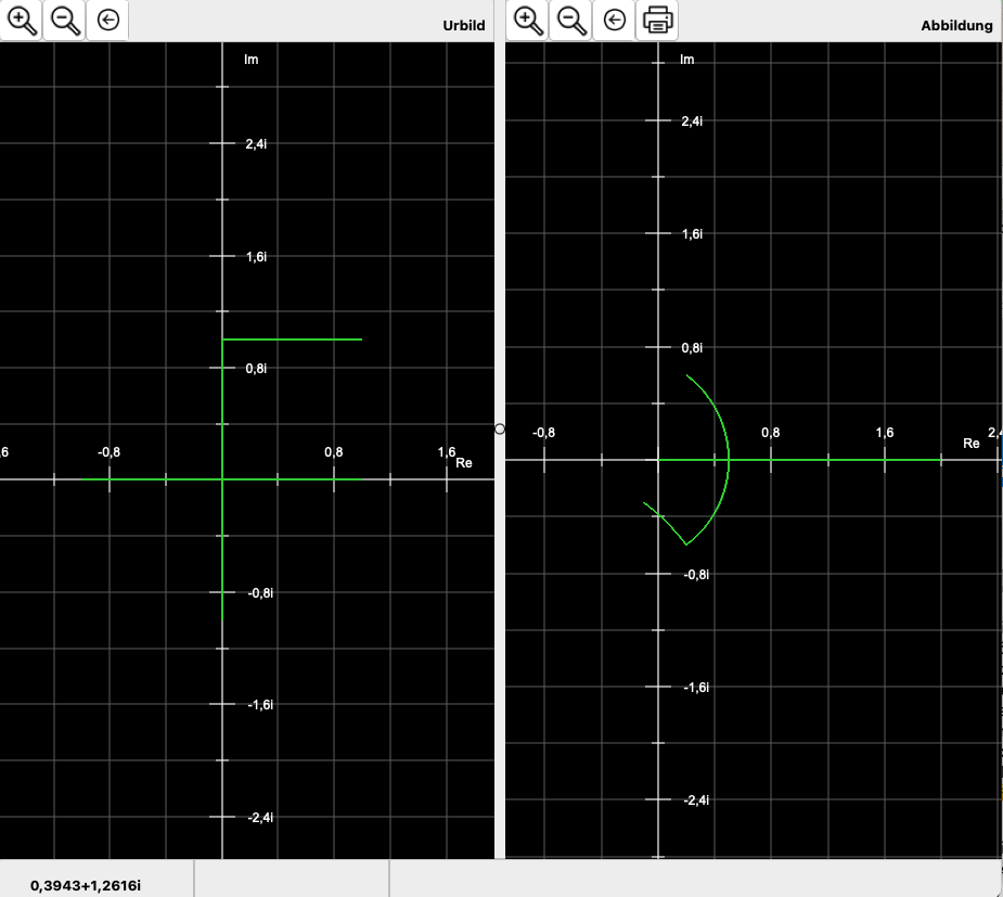 Nach dem Anklicken des Schalters Grafik erstellen schaltet CGRAPH auf den Reiter Darstellung um und zeigt die Grafik - links das Urbild, rechts die Abbildung über der Funktion.