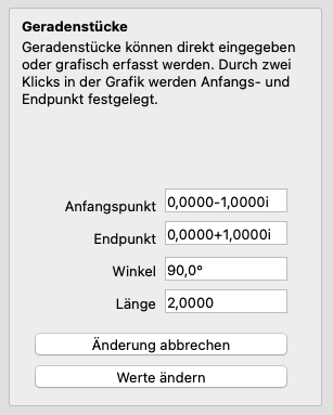 Die Felder Anfangspunkt und Endpunkt sind komplexe Zahlen. Werden sie eingegeben, ändern sich passend dazu die Agaben in den Feldern Winkel und Länge. Es ist auch möglich, ein Geradenstück statt übver den Endpunkt über seinen Winkel und seine Länge einzugeben, CGRAPH berechnet dann automatisch den Endpunkt.