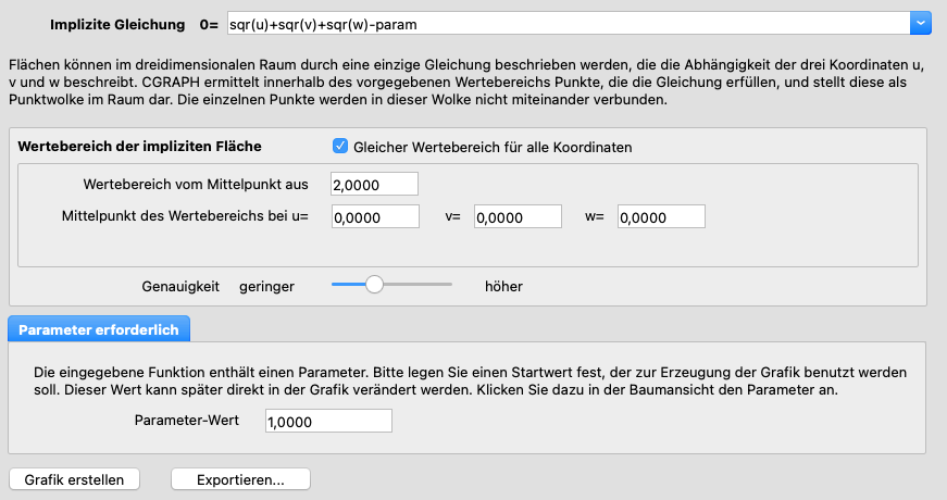 CGRAPH ermittelt die Werte für u, v und w für implizite Flächen innerhalb der angegebenen Werte. Wahlweise können dazu einheitliche Werte für alle drei Koordinaten genutzt werden, ausgehend von einem Mittelpunkt, wenn das Feld Gleicher Wertebereich für alle Koordinaten markiert ist.