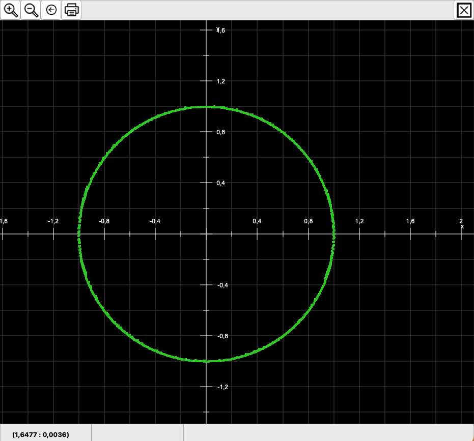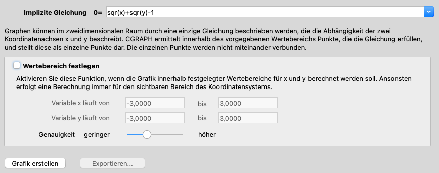 Der Regler Genauigkeit ist nur aktiv, wenn ein eigener Wertebereich festgelegt wurde. Während CGRAPH das Ergebnis der Gleichung anhand der Wertebereiche für x und y prüft, sind alle Werte, die näher an Null liegen als die hier eingestellte Genauigkeit, gültige Ergebnisse. Je nach Größe der Grafik und ihrem Verhältns zum eingestellten Wertebereich kann es notwendig sein, hier nachzujustieren, wenn zu wenige oder zu viele Ergebnisse angezeigt werden.