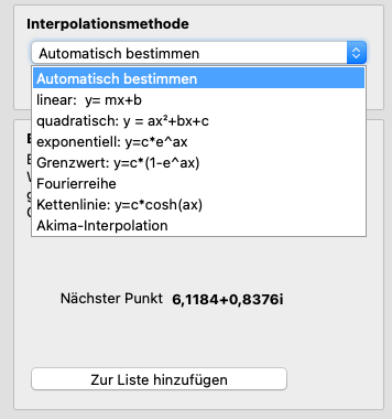Vorausgewählt ist die Interpolationsart automatisch - dann versucht CGRAPH, anhand der eingegebenen Werte die beste Interpolationsart zu bestimmen - das ist jene, bei der die Abweichung der berechneten Kurve von den eingegebenen Eingangsewerten am geringsten ist.
