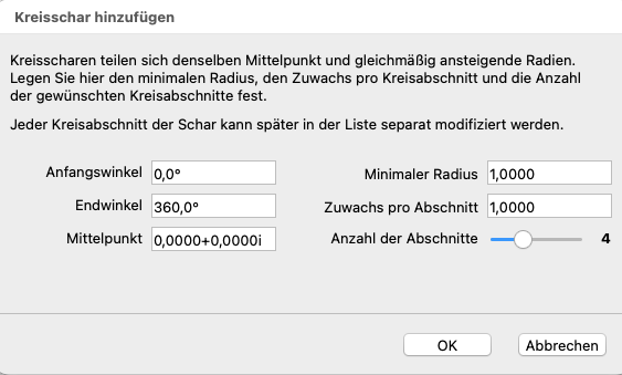 Kreisscharen teilen sich denselben Mittelpunkt und besitzen gleichmäßig ansteigende Radien. Es können daher Anfangs- und Endwinkel, der gemeinsame Mittelpunkt, der Radius des kleinsten Kreisabschnitts, der Radienzuwachs pro Abschnitt und die Anzahl der Abschnitte festgelegt werden. Nach einem Klick auf OK werden die Werte in die Liste der Kreisabschnitte übernommen. Sie können dann dort auch wieder einzeln editiert werden, um weitere Anpassungen vorzunehmen.