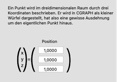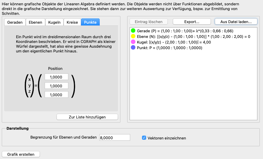 Ein Punkt wird beschrieben durch seinen Ortsvektor (x/y/z). Der Ortsvektor kann (getrennt für x-, y- und z-Koordinate) im Reiter Punkte eingegeben werden Ein Klick auf den Knopf Zur Liste hinzufügen zeigt den Punkt dann im rechten Fenster an. Es wird dabei eine Prüfung vorgenommen, ob der Punkt bereits Teil der Liste ist.