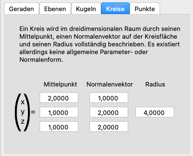 Ein Kreis wird beschrieben durch seinen Mittelpunkt, einen Normalenvektor in der Kreisebene und seinen Radius. Der Radius und die Vektoren (getrennt für x-, y- und z-Koordinate) können im Reiter Kreise eingegeben werden Ein Klick auf den Knopf Zur Liste hinzufügen zeigt den Kreis dann im rechten Fenster an. Es wird dabei eine Prüfung vorgenommen, ob der Kreis bereits Teil der Liste ist.