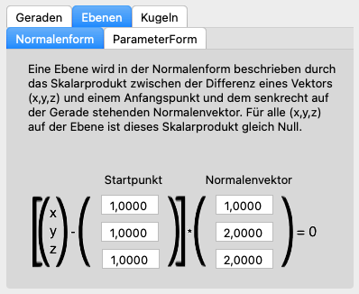 Eine Ebene in Normalenvektordarstellung besitzt einen Startpunkt und einen Vektor, der senkrecht auf der Ebene steht. Beide können getrennt für x-, y- und z-Koordinate im Reiter Ebenen/Normalenmform eingegeben werden Ein Klick auf den Knopf Zur Liste hinzufügen zeigt die Ebene dann im rechten Fenster an. Es wird dabei eine Prüfung vorgenommen, ob die Ebene bereits Teil der Liste ist. CGRAPH erkennt dabei auch Angaben, die nicht exakt dieselbe Definition haben (bspw. einen anderen Startpunkt), aber dennoch dieselbe Ebene beschreiben.