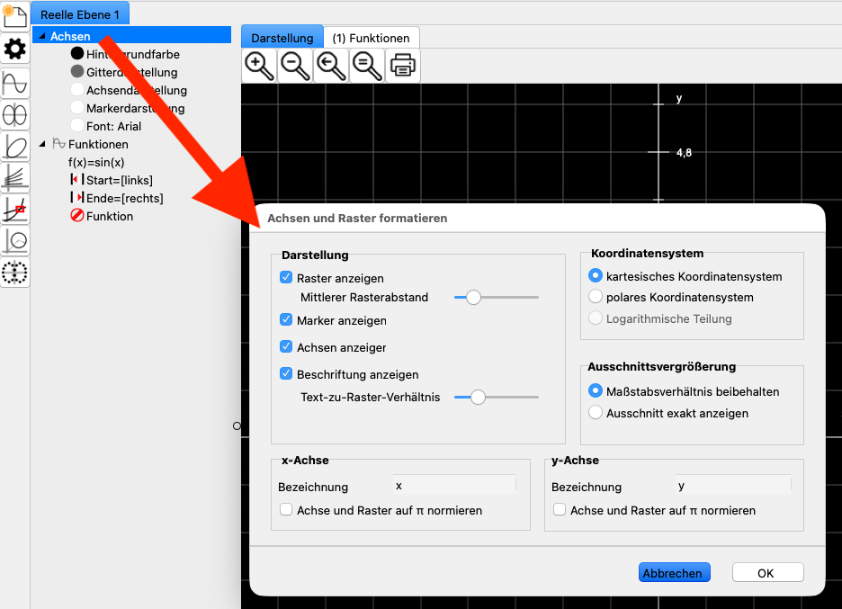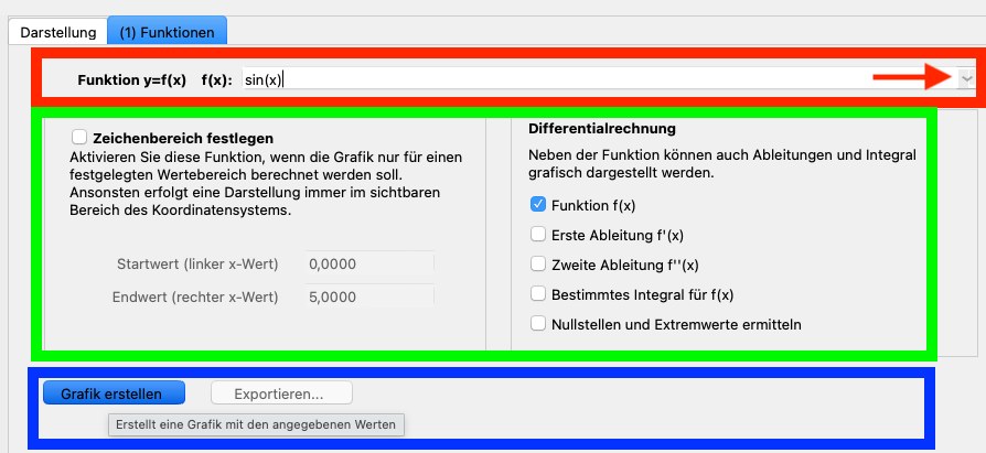 Nun ändert sich der Fensterinhalt. Links (grüner Pfeil) erscheint ein Baum, in dem grundsätzlich alle Inhalte einer Grafik aufgelistet werden und auch deren Farben und Erscheinung geändert werden kann. Im rechten Bereich erscheint ein Fenster, das die Vorgabewerte für die Grafikfunktion enthält (roter Pfeil). Außerdem wird die Funktionenleiste am linken Rand beschränkt auf alle Grafikfunktionen, die später im selben Grafikfenster dargestellt werden können. Alle anderen werden ausgeblendet.
