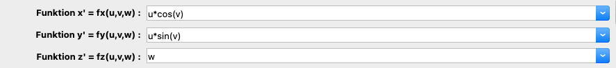 Es sind nur Funktionen zulässig, die die Variablen u, v, w und param enthalten. Geben Sie im Eingabefeld für die Funktionen die gewünschten Funktionen ein, oder wählen Sie eine der bereits vorhandenen Funktionen durch Klick auf den Pfeil rechts vom jeweiligen Eingabefeld.