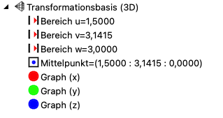 Im unteren können Bereich zudem die Ausdehnung und Position des Würfelgitters für die Variablen u, v und w sowie über die Schieberegler die Anzahl der Linien der Gitterseiten gewählt werden.