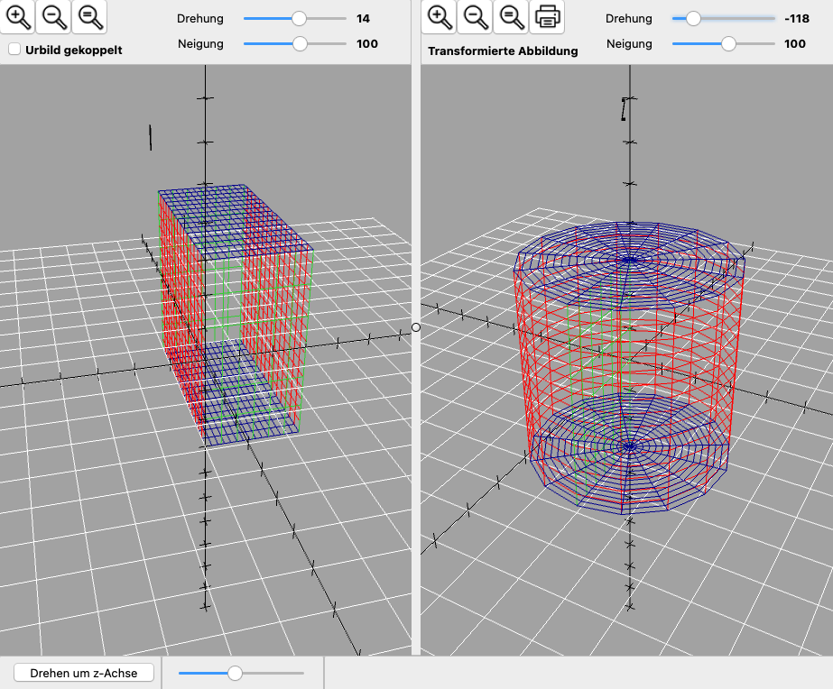 Der Schalter Urbild gekoppelt erlaubt eine gemiensame Skalierung und Einstellung der Winkel für Drehung und Neigung. Alle Funktionen zur Änderung des sichtbaren Bildbereichs wrken sich dann auf beide Ansichten gleichermaßen aus,