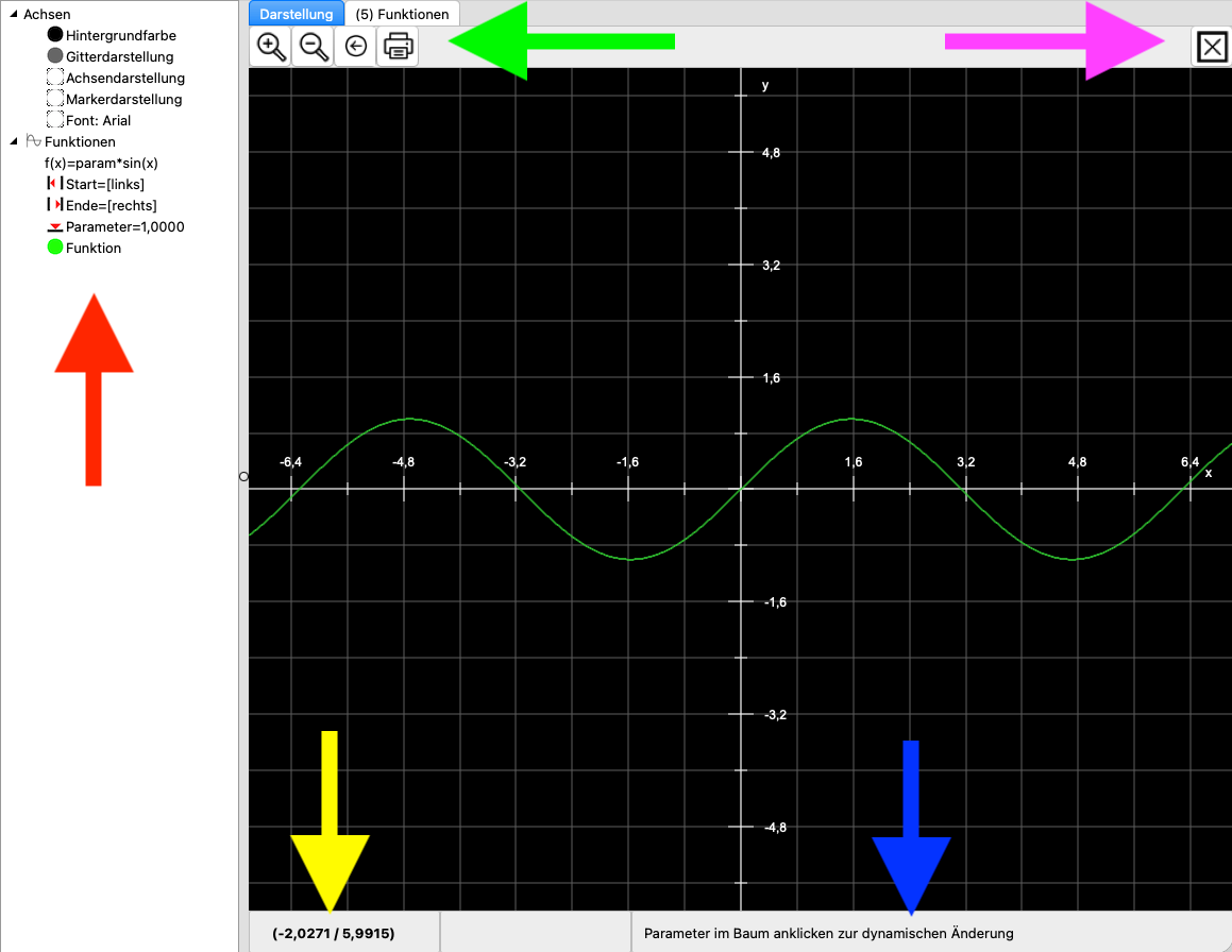 | Statusleiste (gelber Pfeil) | Zeigt links die aktuelle Koordinate des Mauszeigers in der Grafik an. Abhängig vom Typ der Grafik können das reelle (x/y)-Werte sein oder eine komplexe Zahl . Das zweite Feld zeigt eine Koordinate, wenn mit der Maus ein Ausschnitt gewählt wird. |