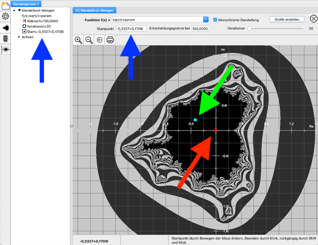 - Ein einfacher Klick beendet die Veränderung des Startpunkts oder Parameters. Das rote Quadrat zeigt nun den neuen Wert des Startpunkts oder Parameters an.
