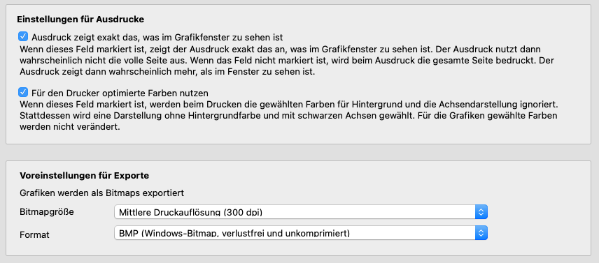 Grafiken können gedruckt oder als hochauflösende Bitmaps gespeichert werden. Diese Einstellungen legen die grundsätzlichen Parameter fest..