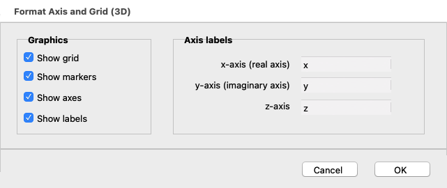 In the Graphics section, you can set which parts of the axes should be visible: grid, markers, axes and labelling. Visibility can also be switched on and off by clicking on the respective coloured symbol.