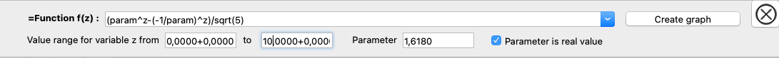 The example shows a function that returns the numbers of the Fibonacci sequence as zero points for a parameter tau (golden ratio = 1.6180339887…). However, if you vary the parameter, the display changes completely.